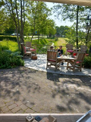 Geniet van koffie / thee met streekeigen lekkers of neem een Wâldpyk lunch op het tuinterras van Op’e Stâl.
